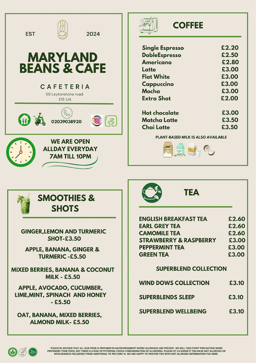 The drinks menu features several tea varieties including English Breakfast, Earl Grey, camomile, peppermint, green tea, and fruit-flavored teas such as strawberry & raspberry. Fresh juices are also offered alongside other beverages.