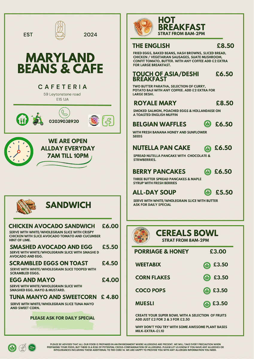 The menu offers a variety of food and drink options suitable for breakfast, light meals, and casual dining throughout the day. It features a selection of breakfast items including the Full English Breakfast, cereals bowls such as porridge with honey and various cereals, as well as English muffins with smoked salmon. There are also Indian-inspired dishes like Deshi Paratha and special egg noodles with chicken, along with a range of sides.